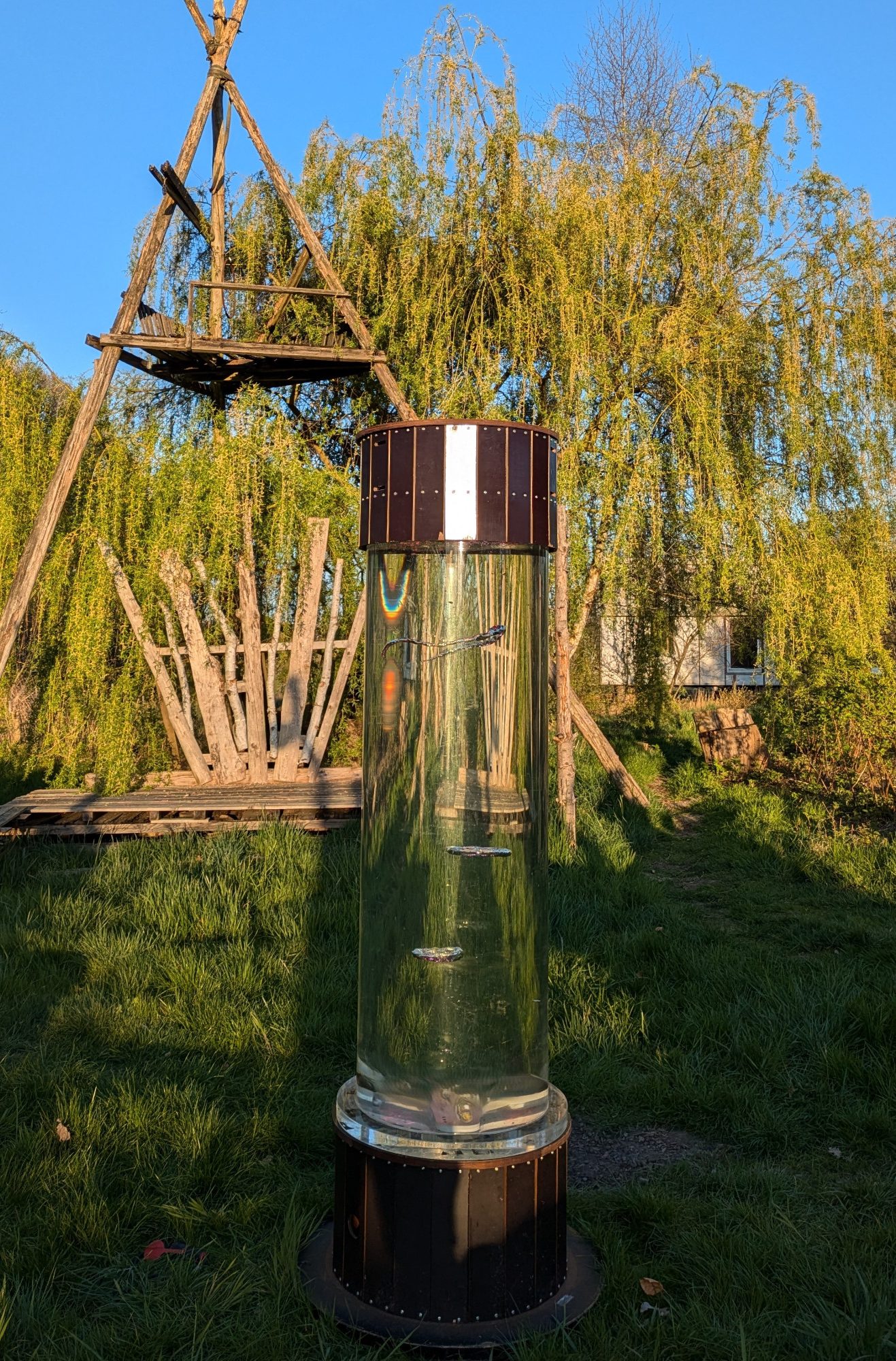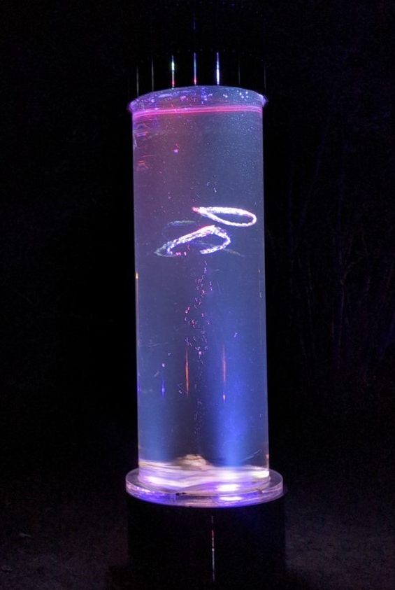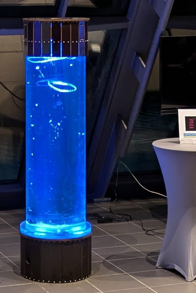 Special impulses, which in nature can only be generated by dolphins, enable the self-organization of water into ascending and interacting vortex rings. This creates a lively, shimmering underwater dance of reflective surfaces. Dive in and let yourself be enchanted by this fascinating installation!